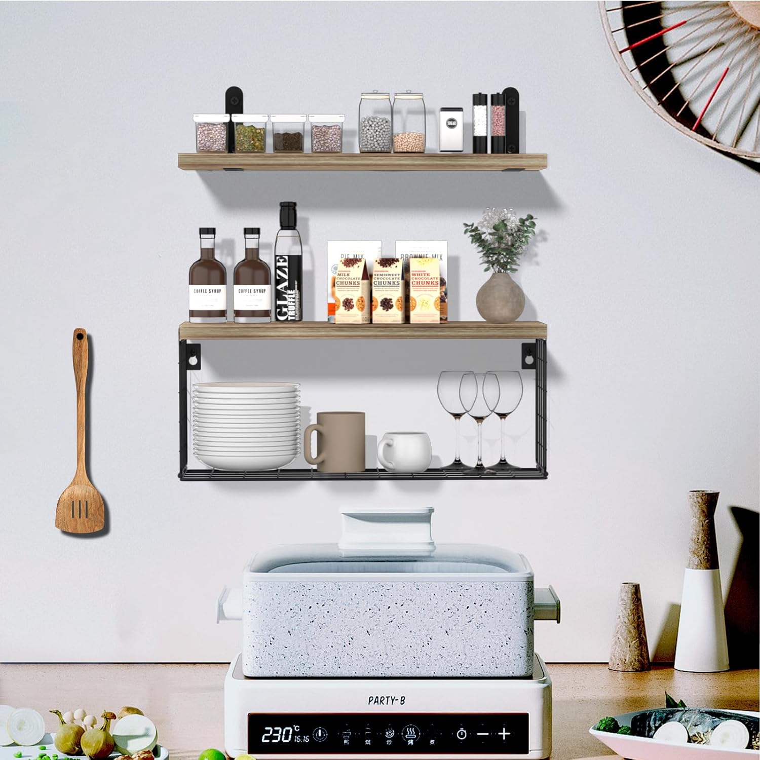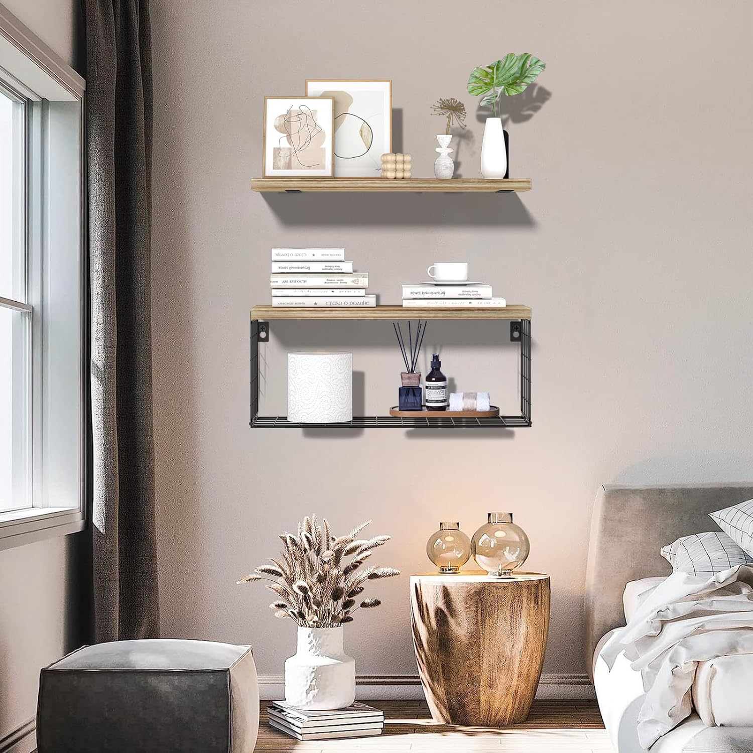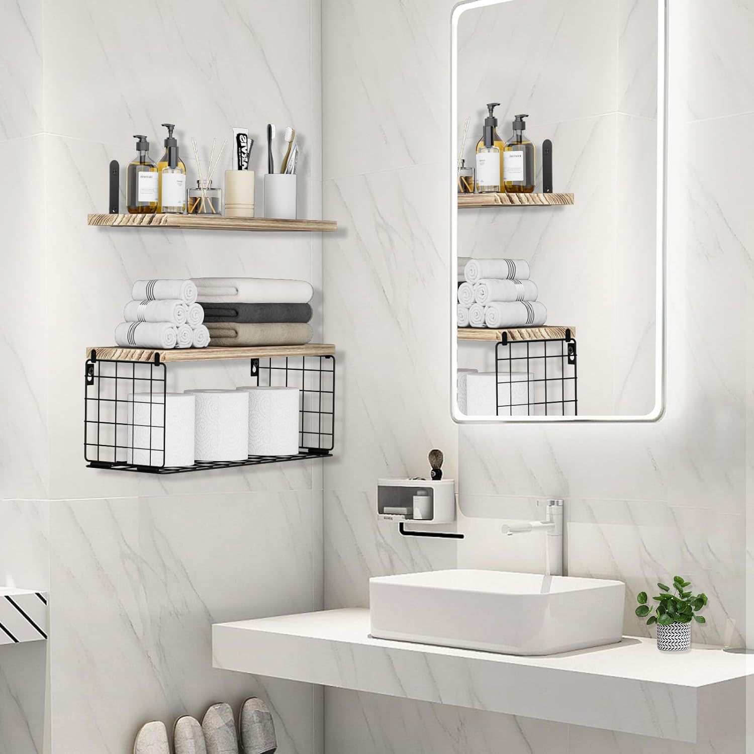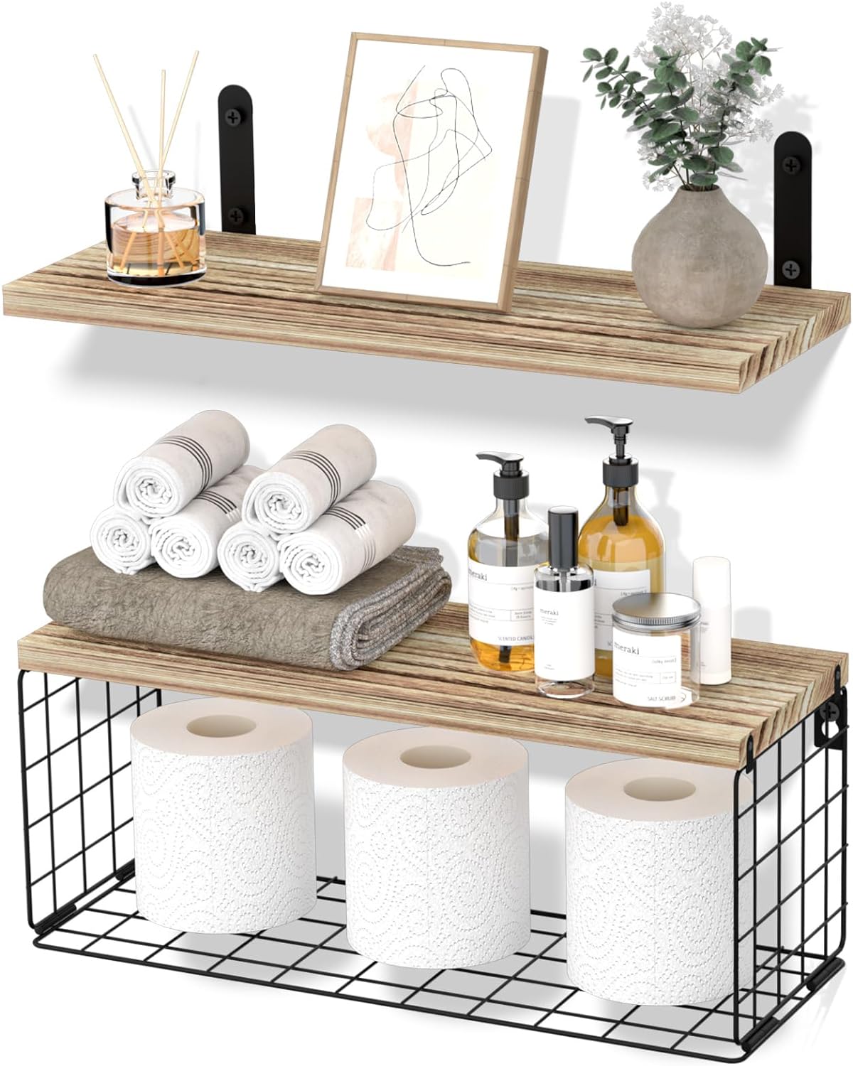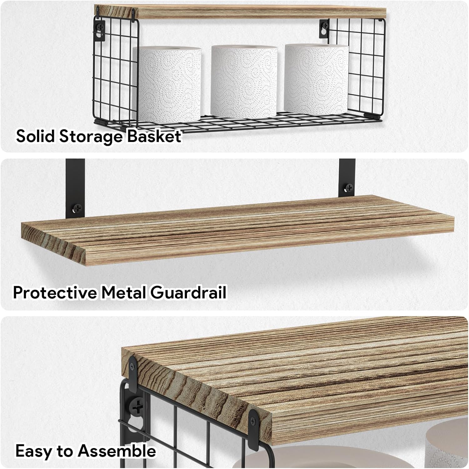 zhongko 41CM Floating Shelves, 2 Set Bathroom Shelves with Wire Storage Basket, Wood Wall Shelves for Bathroom, Kitchen, Bedroom, Living Room, Laundry Room(Dark Brown), Vintage
