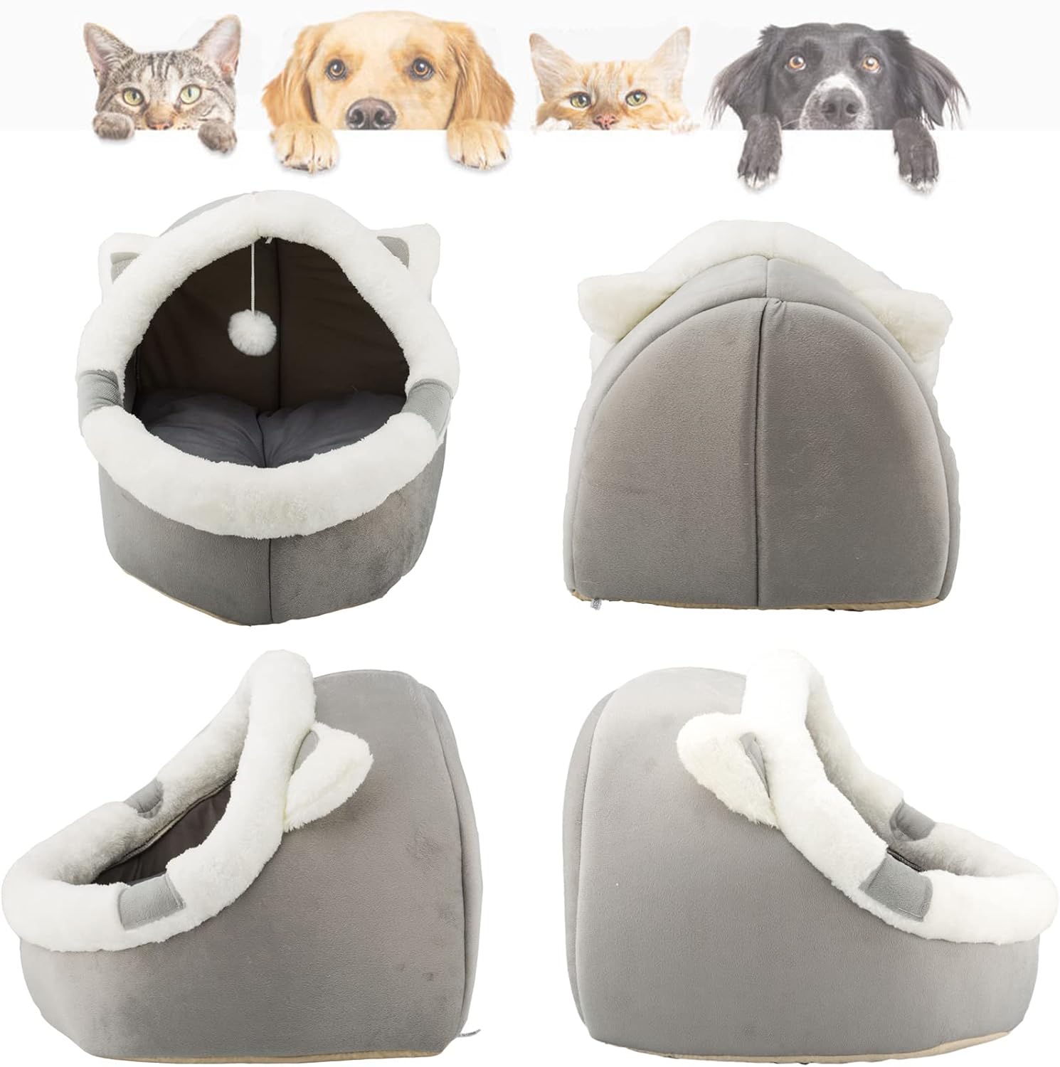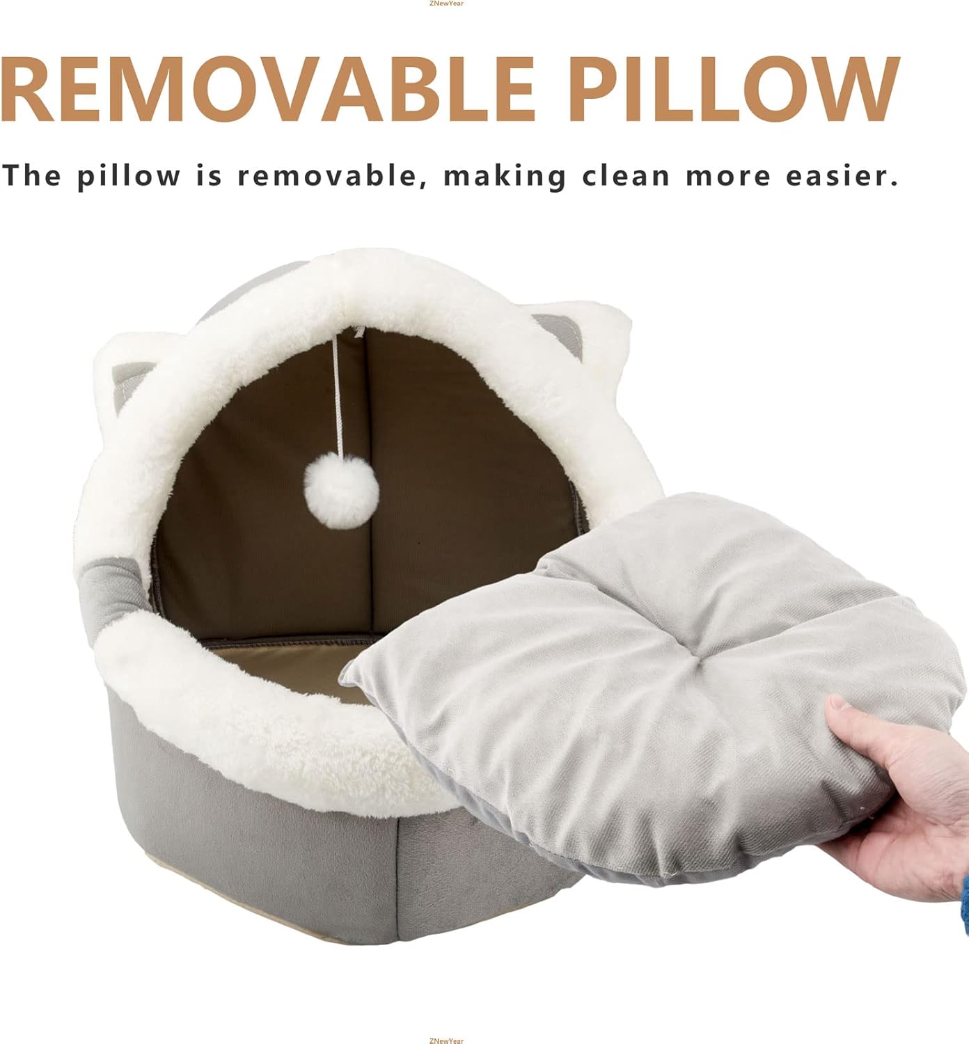 ZNewYear Cat Beds for Indoor with Hanging toy, Small Dog Cave Bed with Anti-Slip, Kitten Tent House Removable Cushioned Pillow, Super Soft Calming Pet Sofa Mats Ideal for Cats and Puppy or Rabbit